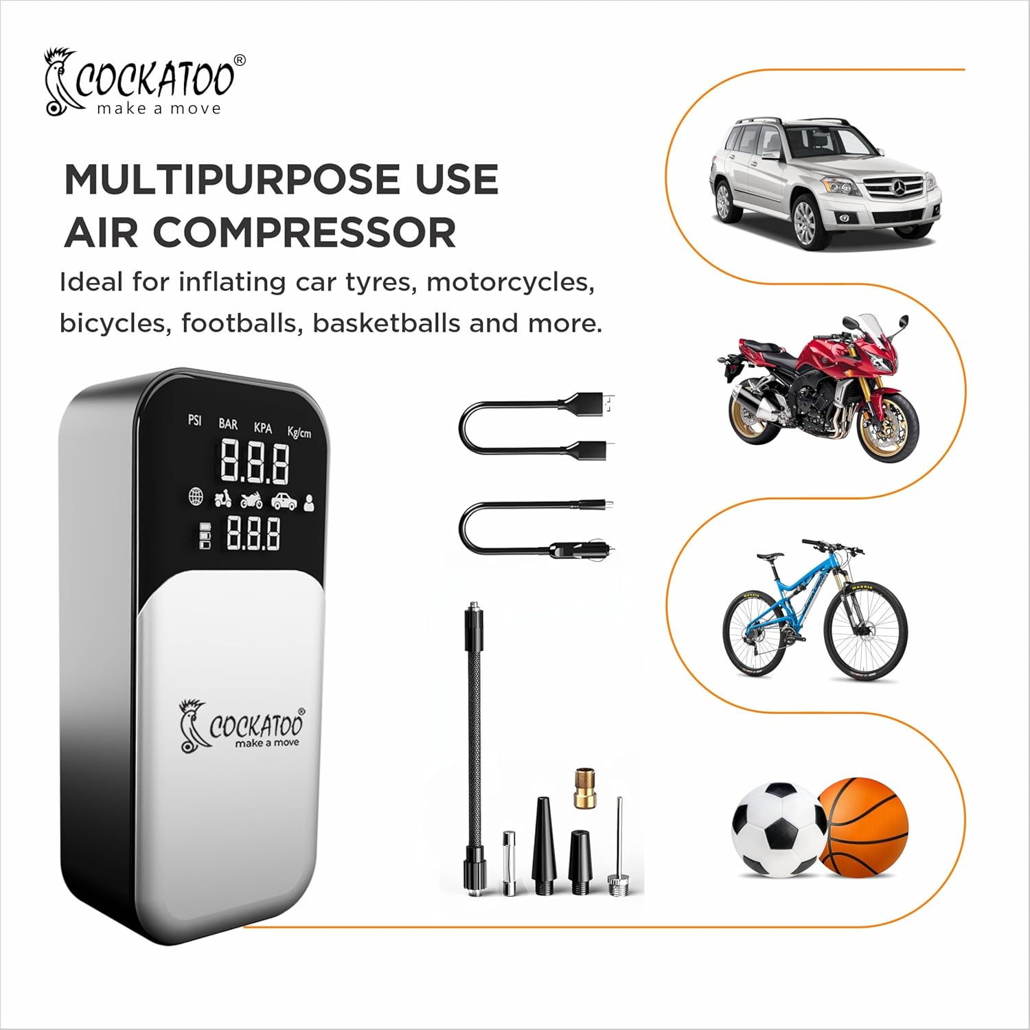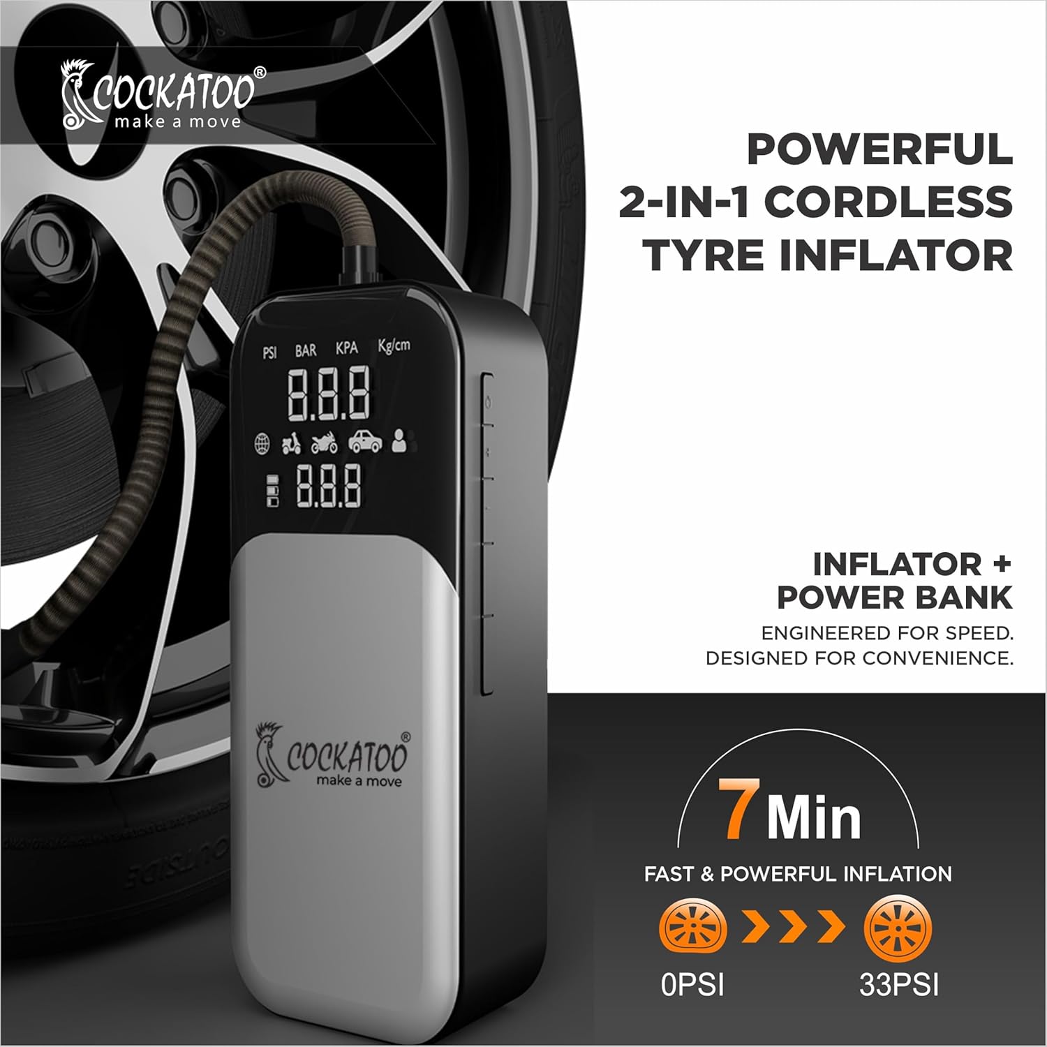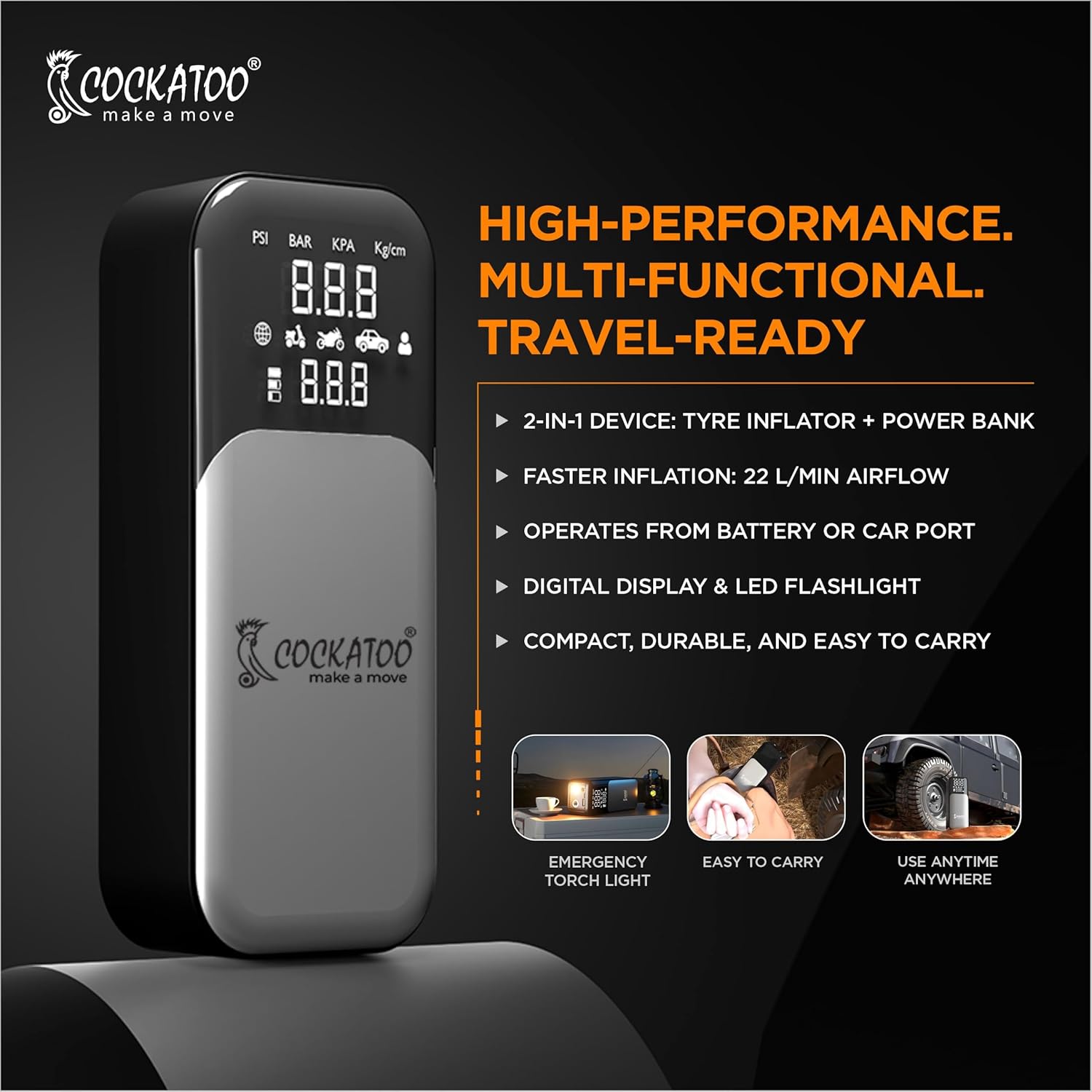 Cockatoo 9166 Tyre inflator High-Power Portable Air Compressor Pump, 80W, 21mm Cylinder, 3x2000mAh Battery, Fast Inflation in 7-8 Minutes, LED Display, Preset Tire Pressure, SOS, USB Charging