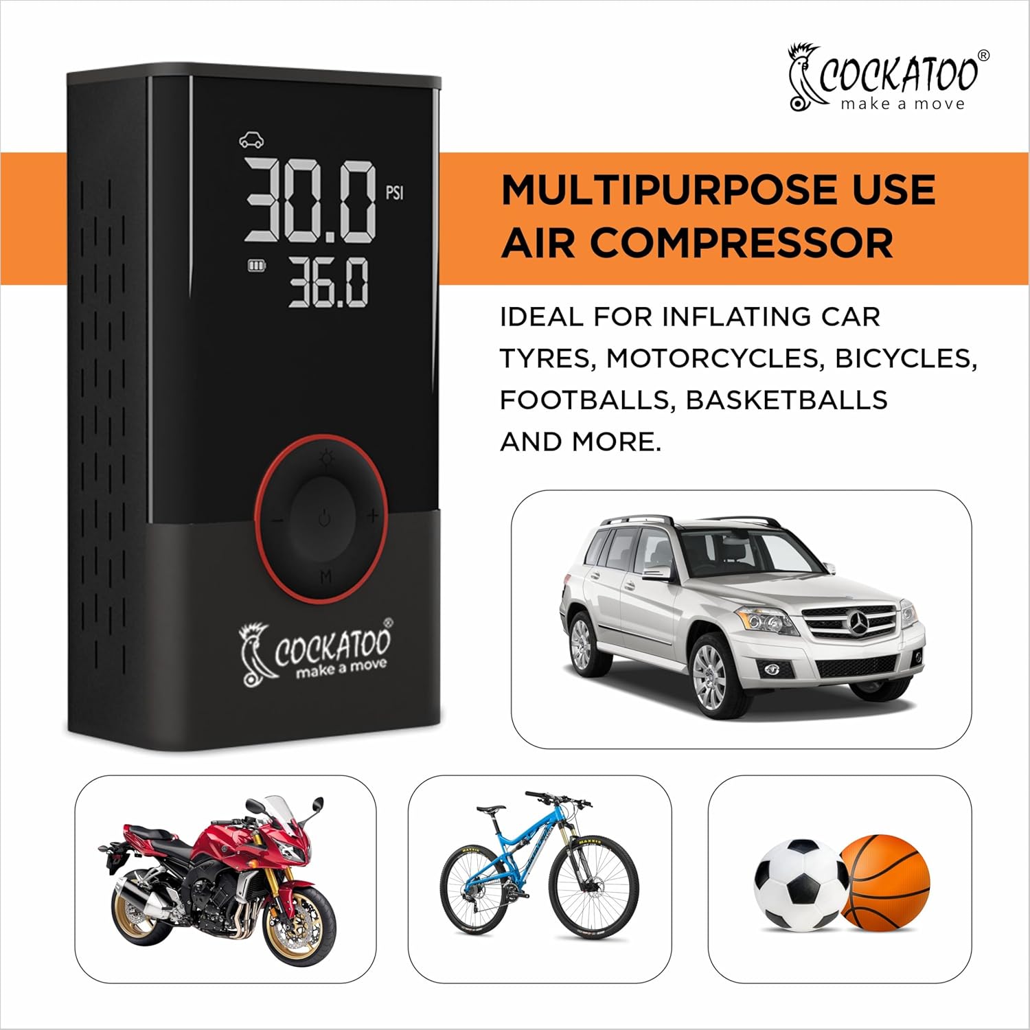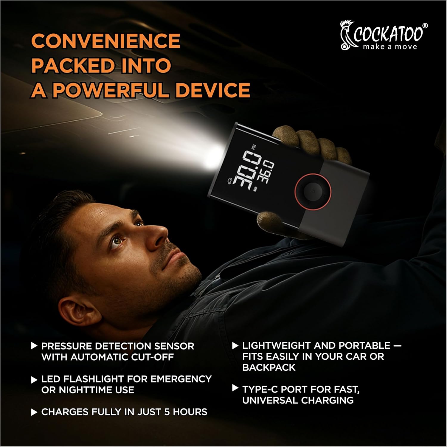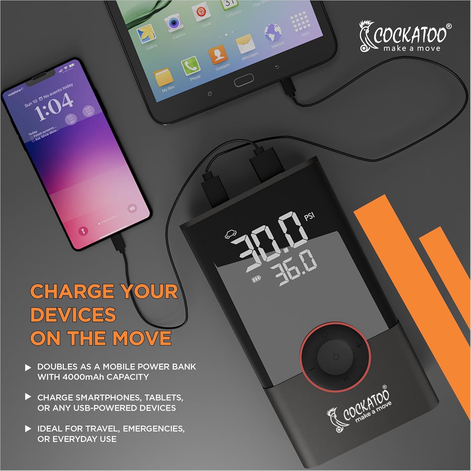 Cockatoo ATJ-005 Tyre inflator Portable Air Compressor Pump with LED Display, 80W Power, 2x2000mAh Battery, Fast Inflation, Tire Pressure Monitoring, Lighting, SOS, and USB Charging.