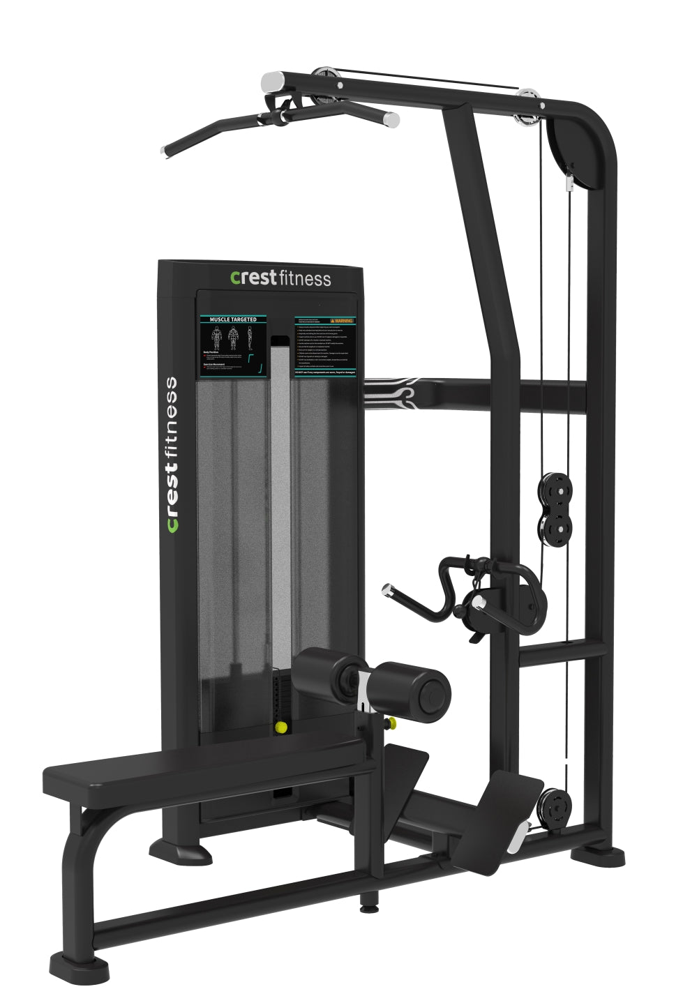 Crest Lat Pull Down + Row machine targets back and shoulder muscles, offering smooth dual-function workouts for strength, posture improvement, and upper body conditioning with adjustable resistance.