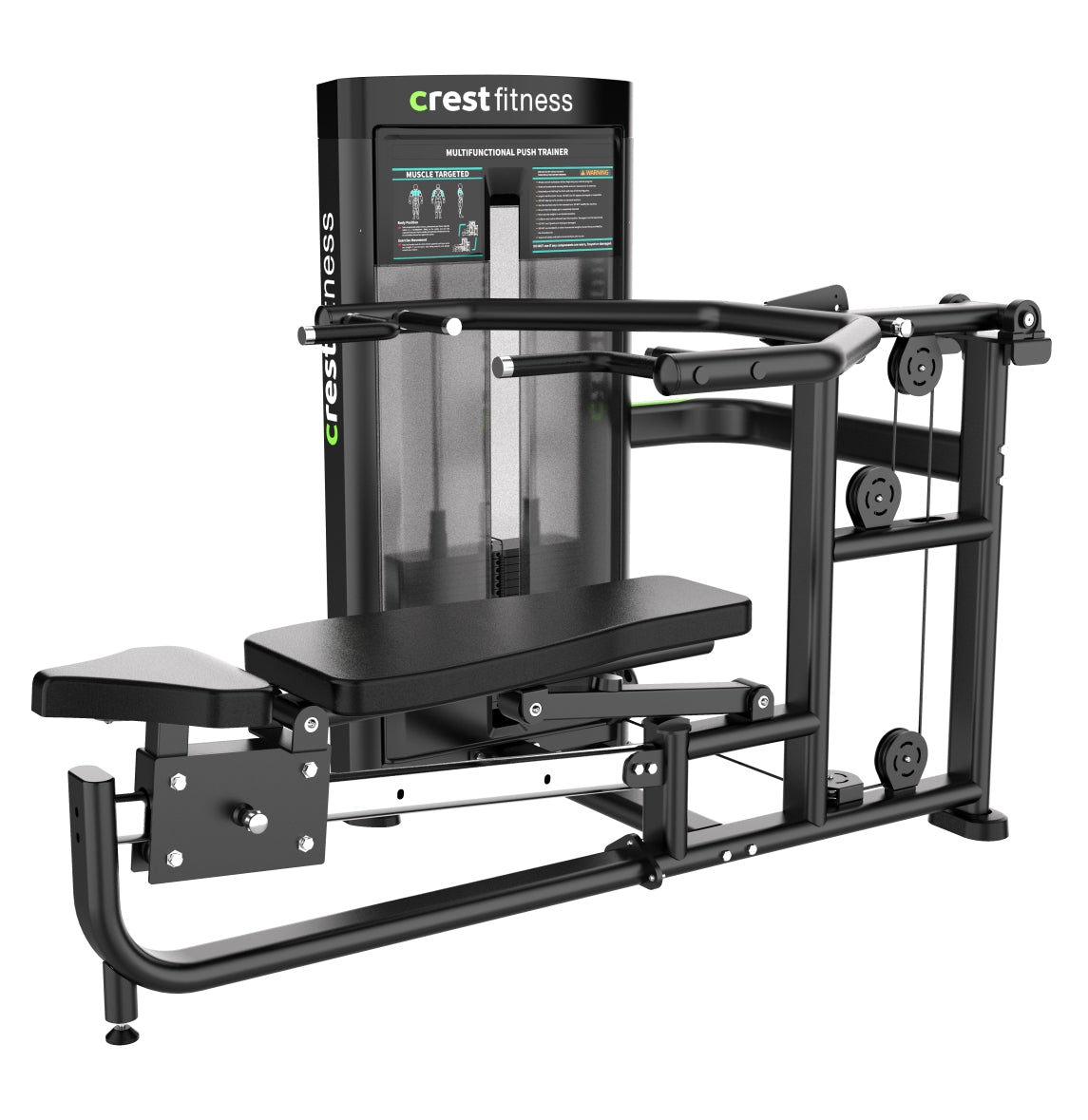 Crest Multi Press durable gym machine with flat oval frame, PU cushion, ABS shroud, alloy steel guide rail, 100 kg weight stack, high-strength cable, stainless guide rod, EN ISO 20957-1 certified.