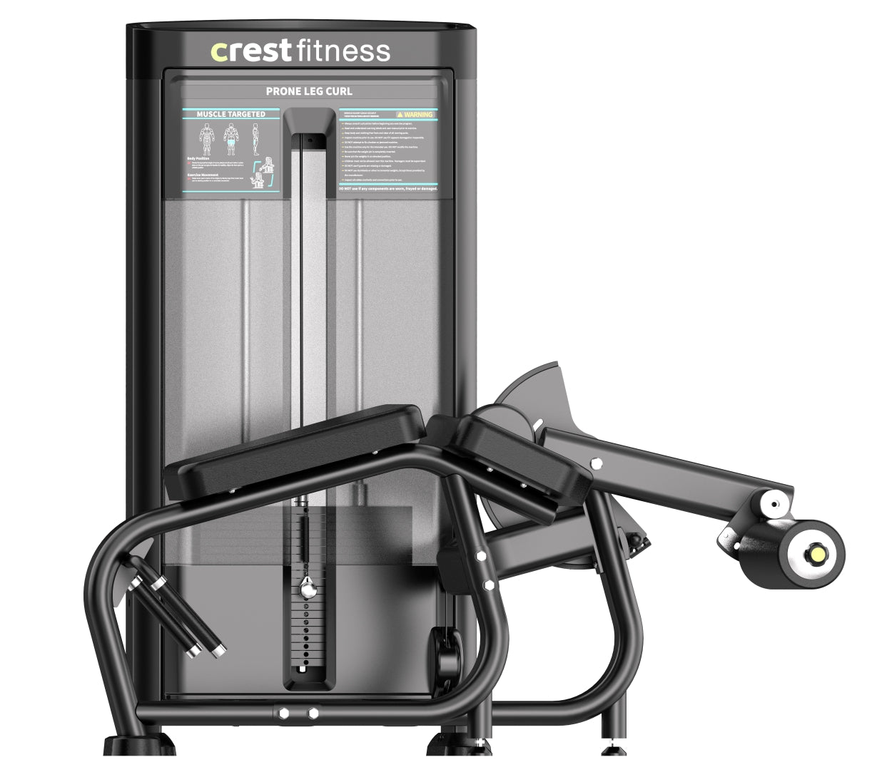 Crest Signature Series Prone Leg Curl features a durable alloy steel frame, PU cushion, 100 kg weight stack, and smooth operation for targeted hamstring strengthening.