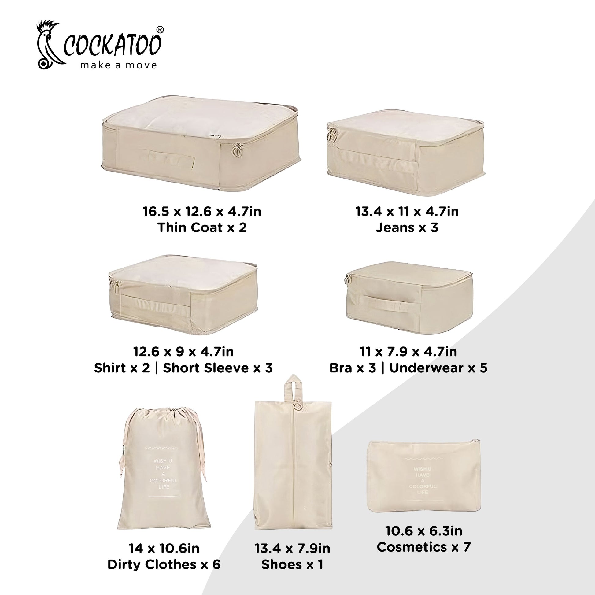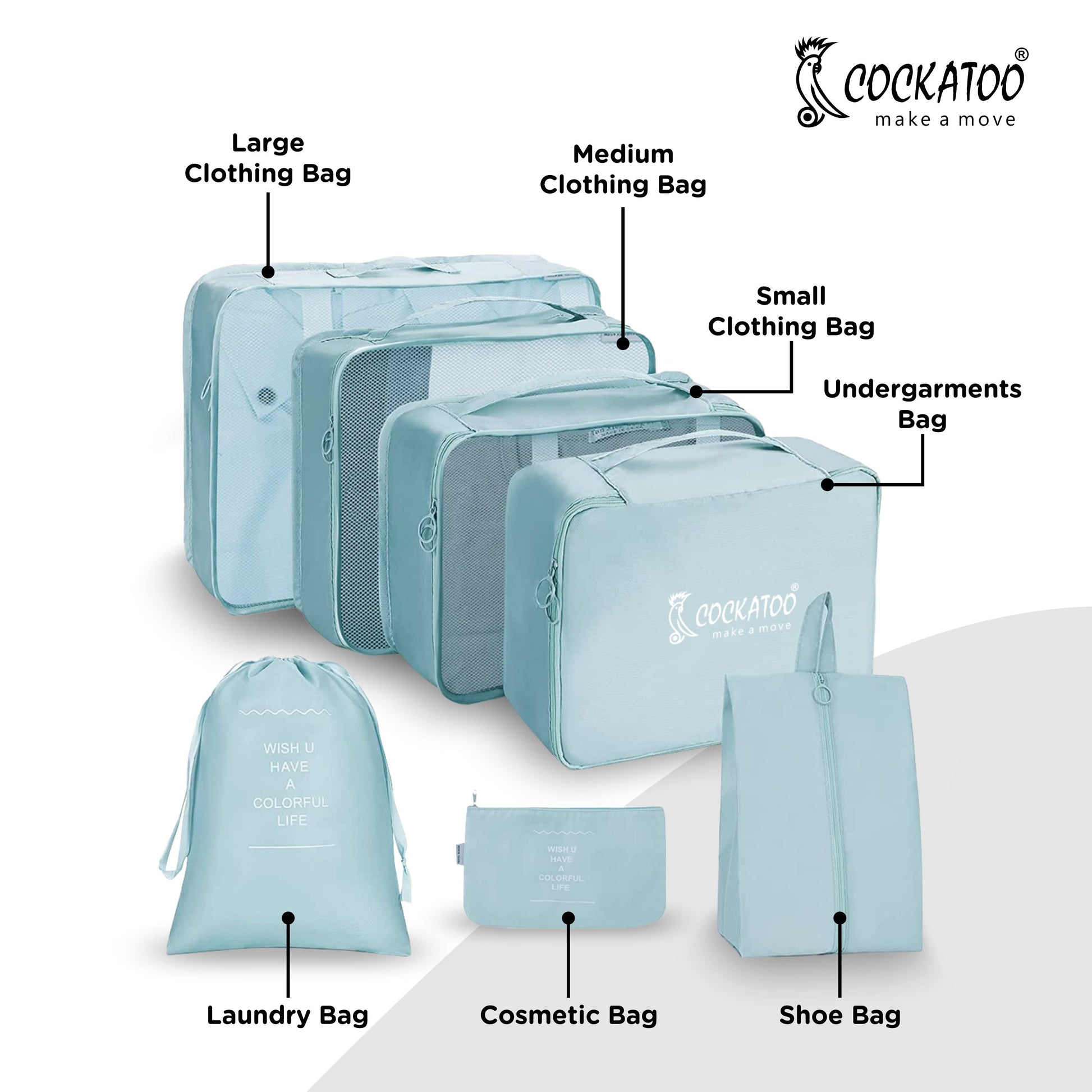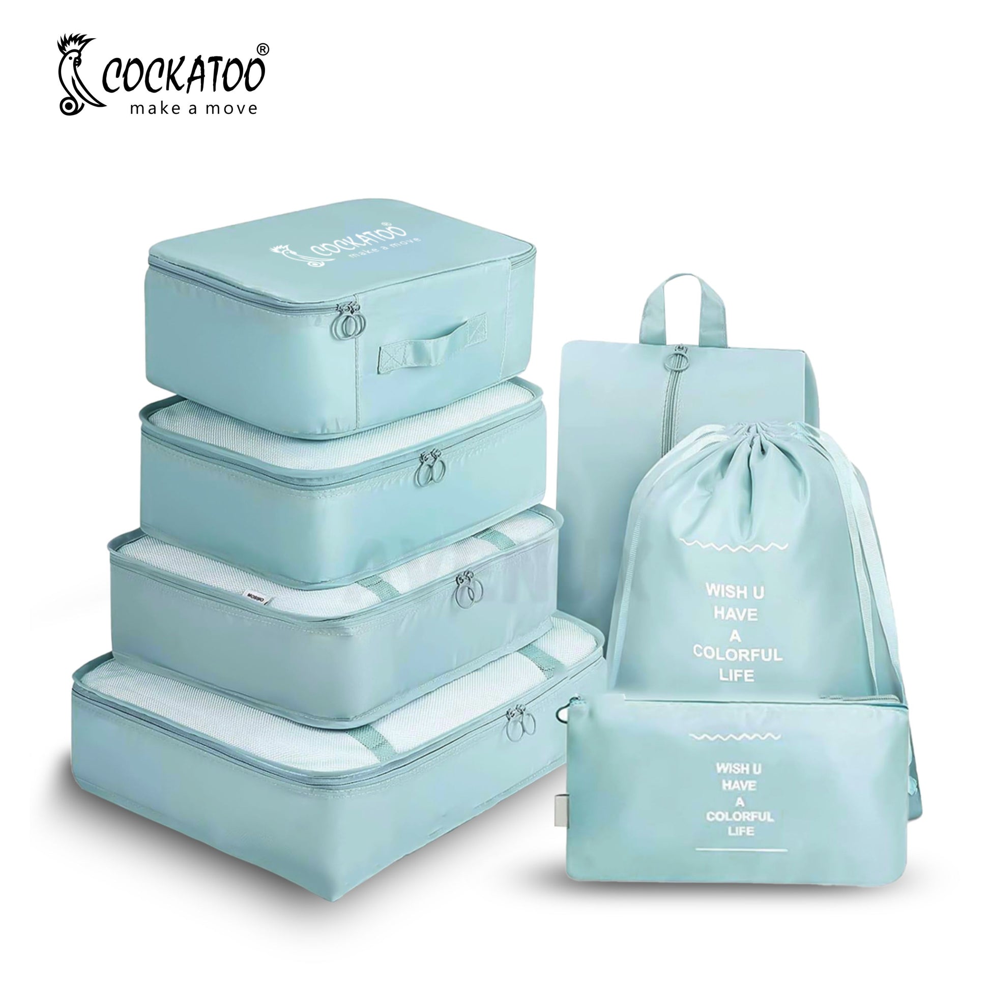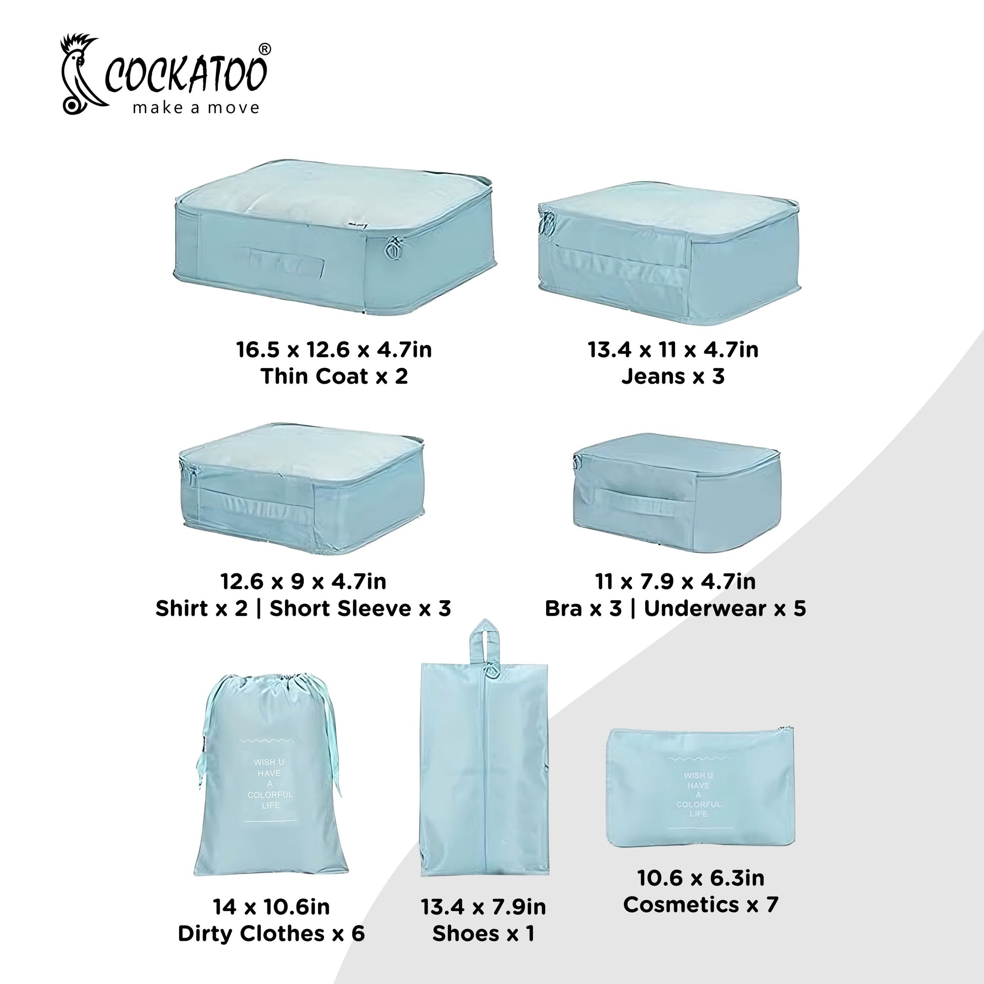 Complete Travel Storage Solution: Simplify your travel packing with the Cockatoo "Jet Set" 7 Pc Travel Storage Bag. This comprehensive set includes versatile bags to organize clothes, toiletries, accessories, and more
