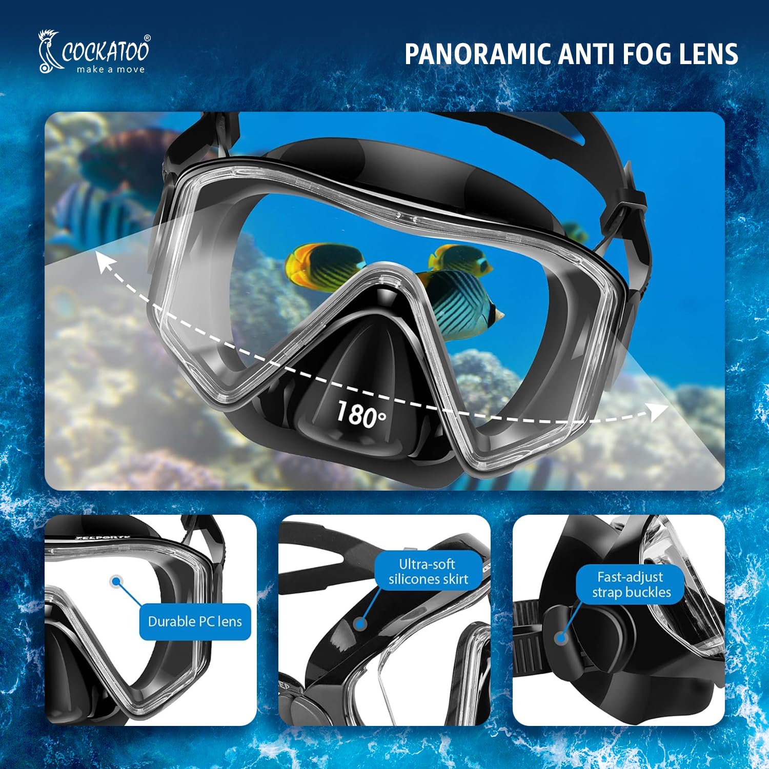 - Anti-fog and anti-leak design: The snorkeling mask is made of panoramic tempered glass with anti-fog treatment, reducing fogging for a clear view of the stunning ocean scenery, while the anti-leak mask design ensures a tight seal to prevent water from entering.