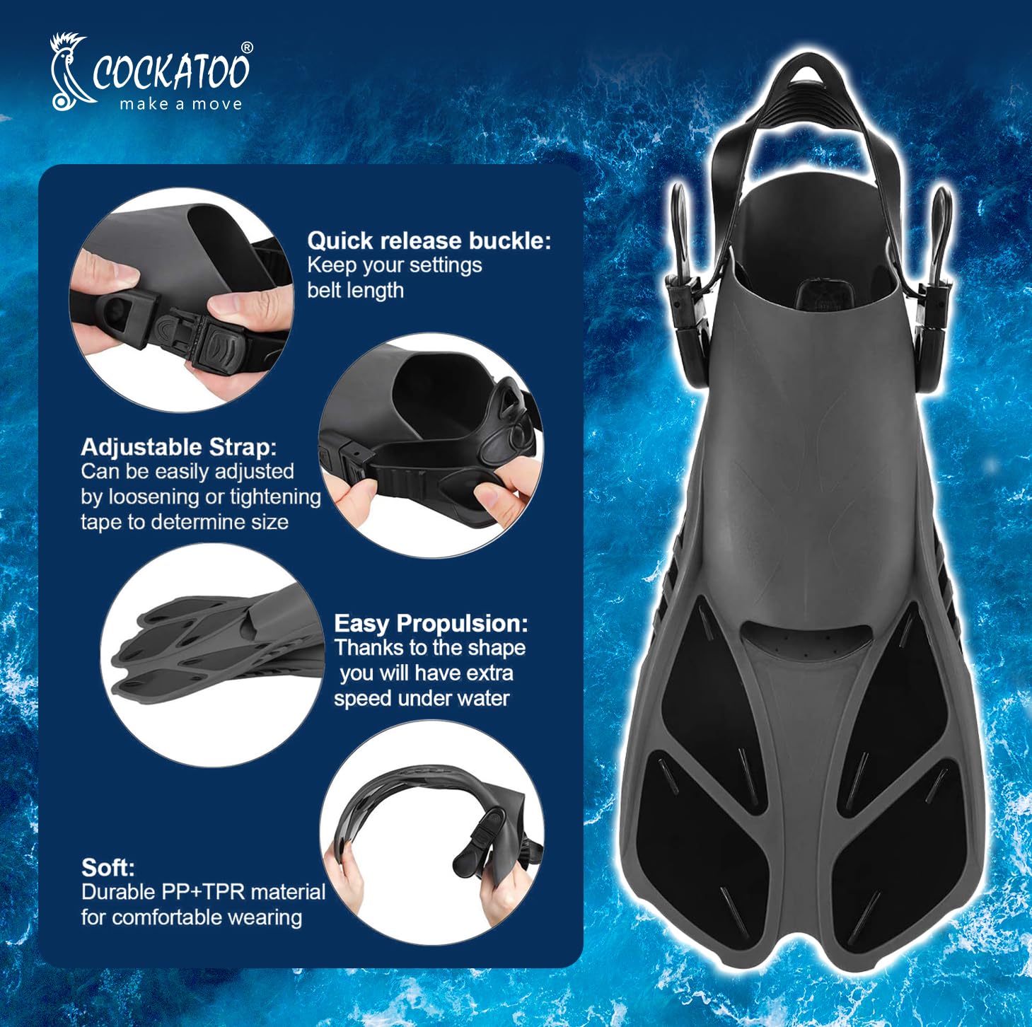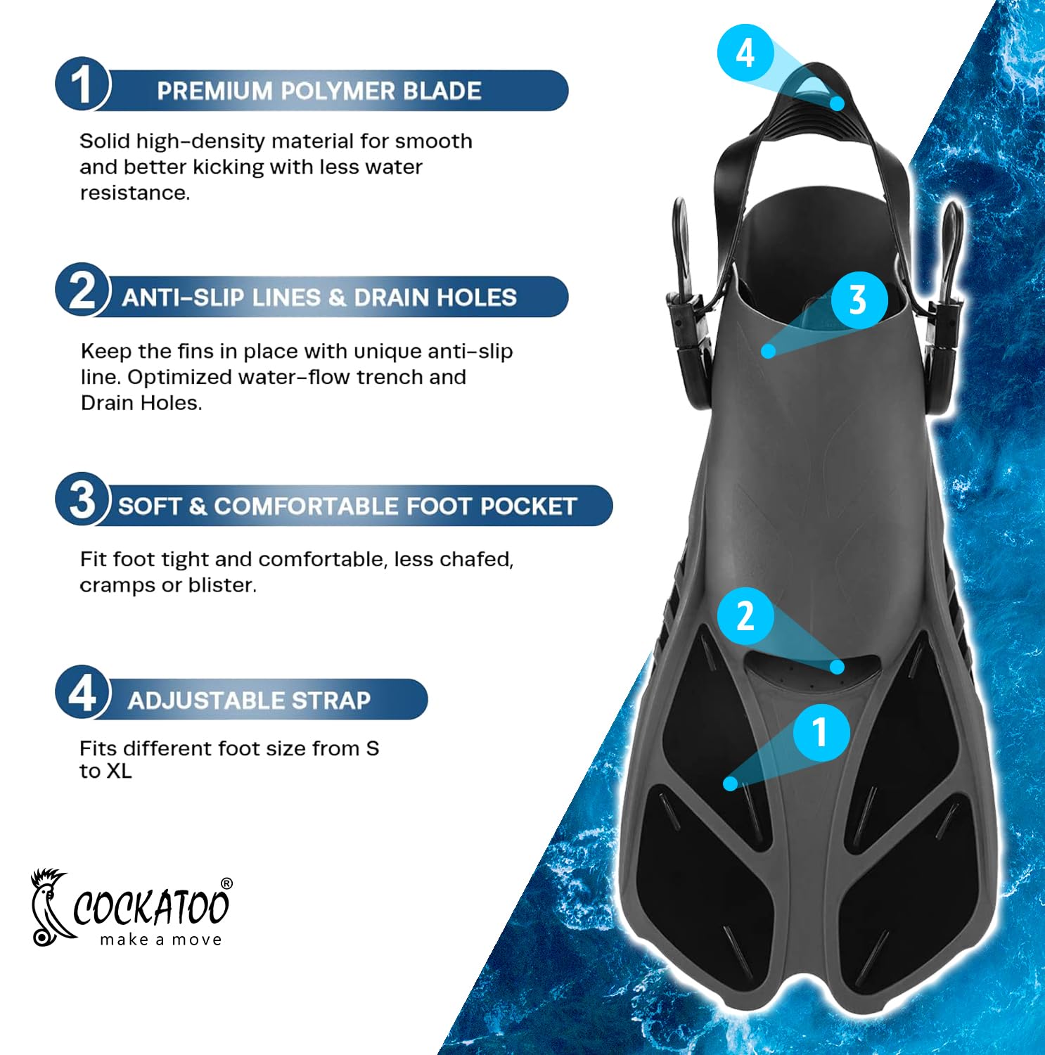 - Complete snorkeling set: The Cockatoo Fin Snorkel Set includes all essential snorkeling gear for adults, featuring a tempered glass diving mask, Rubber and PVC Material trek fins, and a high-quality dry-top snorkel, ensuring an enjoyable underwater experience.