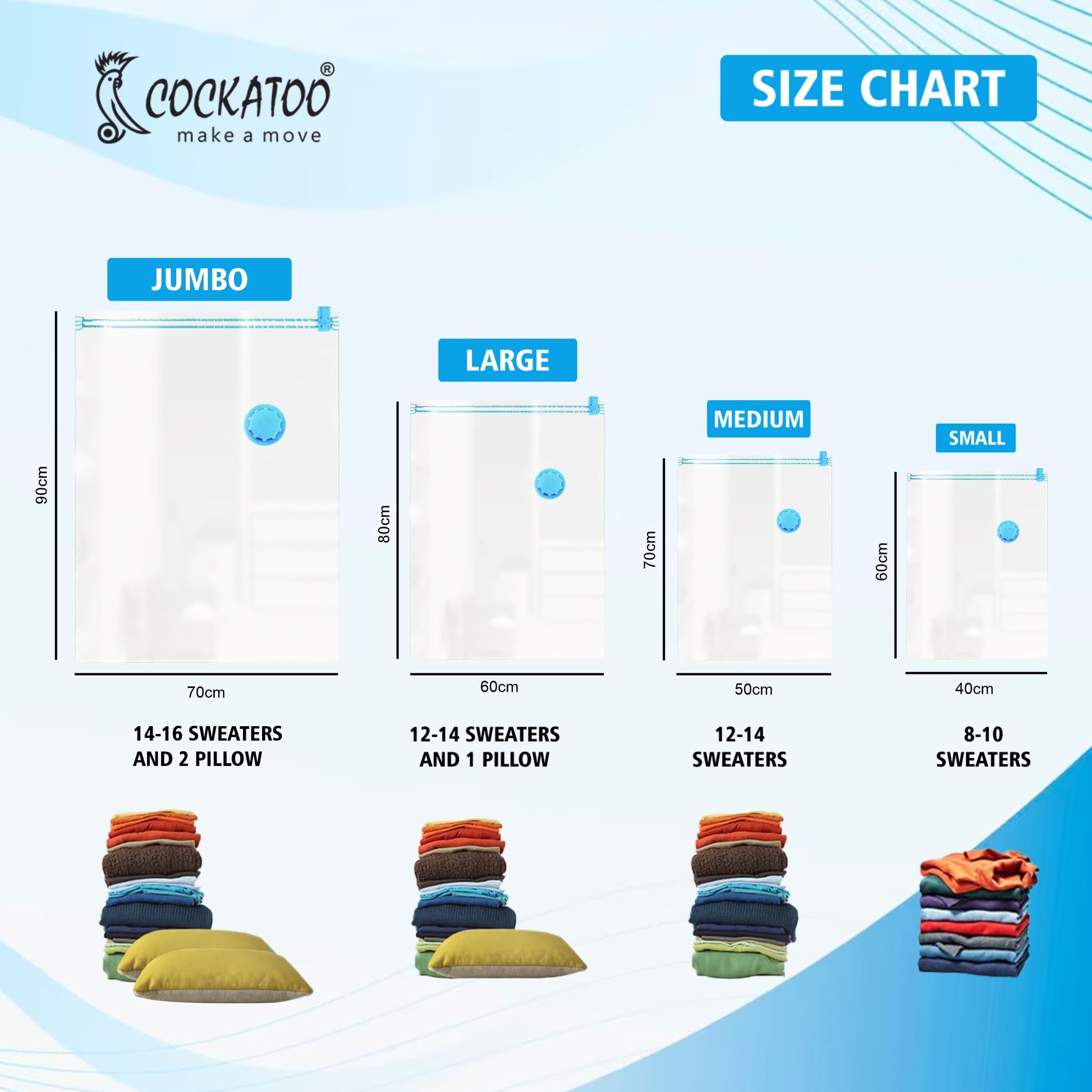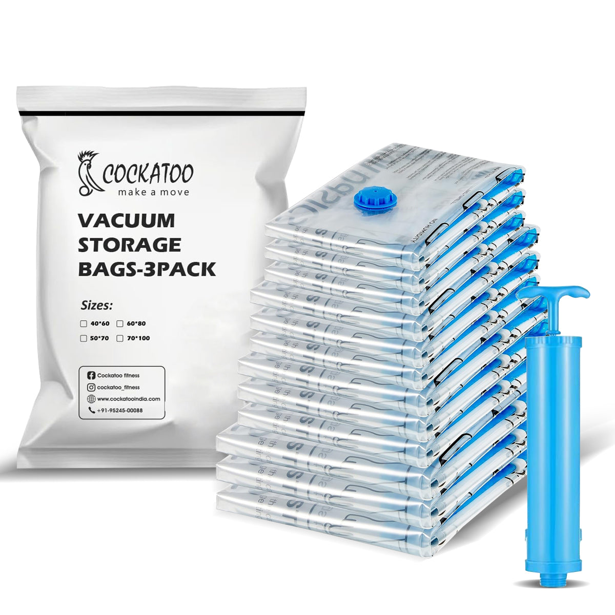 Cockatoo Space-Mate Vacuum Bags for Travel, Vacuum Bags For Clothes With Pump, Travel Essentials For Women & Men, Pack of 12 having 4 different sizes Vacuum Bag S,M,L & XL (40*60) (50*70) (60*80)and (70*100) CM as dimensions