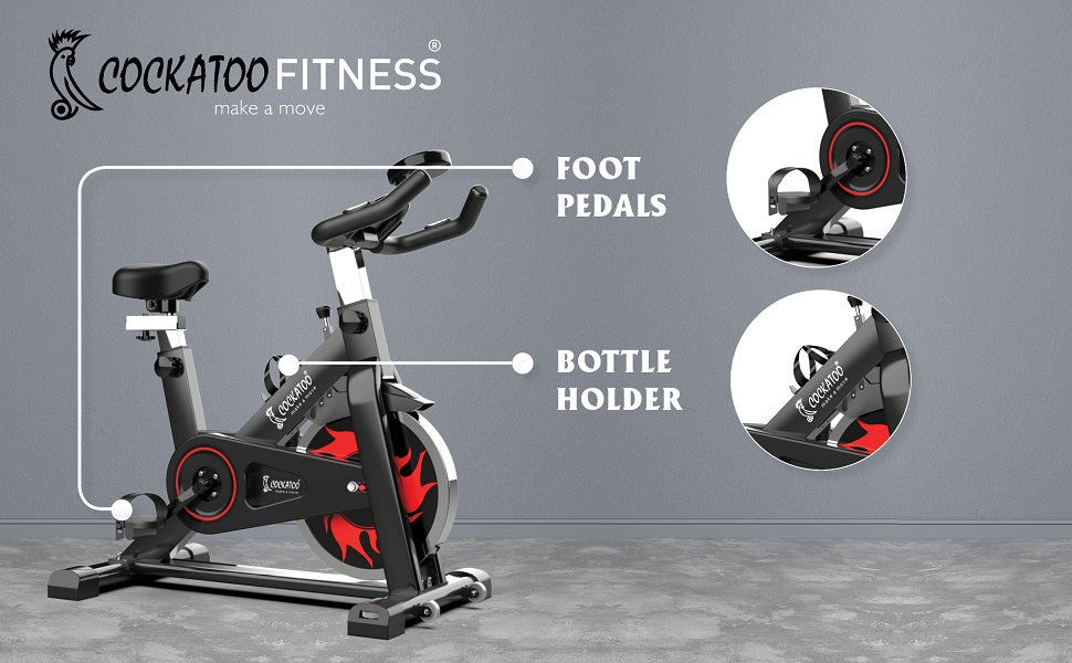- Step into toe-confined adjustable strap pedals or snap into Cockatoo’s clipless SPD-style Compatible pedals.