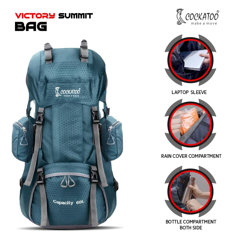 60-liter military-style rucksack bag is built for rugged outdoor use, featuring a MOLLE webbing system that lets you attach tools, trekking poles, tents, sleeping bags, and even a rifle using the side straps and pockets. Ideal as a travel bag for men, it includes a dedicated hydration compartment that holds up to a 3-liter bladder, with a convenient tube port near the grab handle.